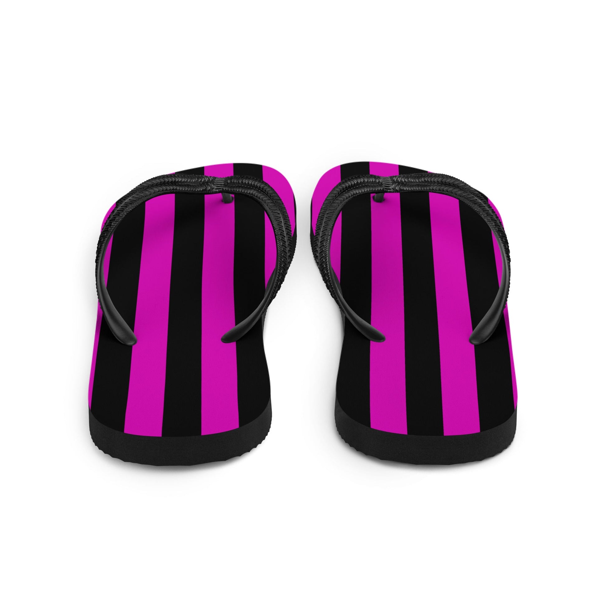 Prepare for an adventurous and carefree summer with a pair of colorful black and pink striped flip flops that are created just for you! The rubber sole is lined with a soft fabric to make sure you feel comfortable wherever your day takes you.