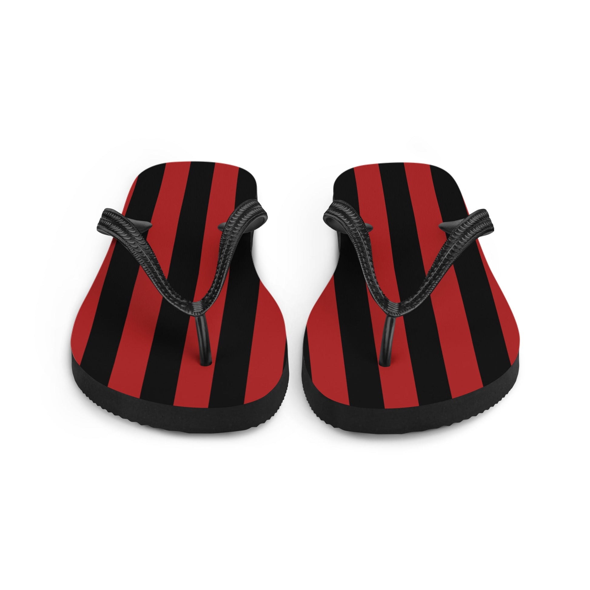 Prepare for an adventurous and carefree summer with a pair of colorful black and red striped flip flops that are created just for you! The rubber sole is lined with a soft fabric to make sure you feel comfortable wherever your day takes you.