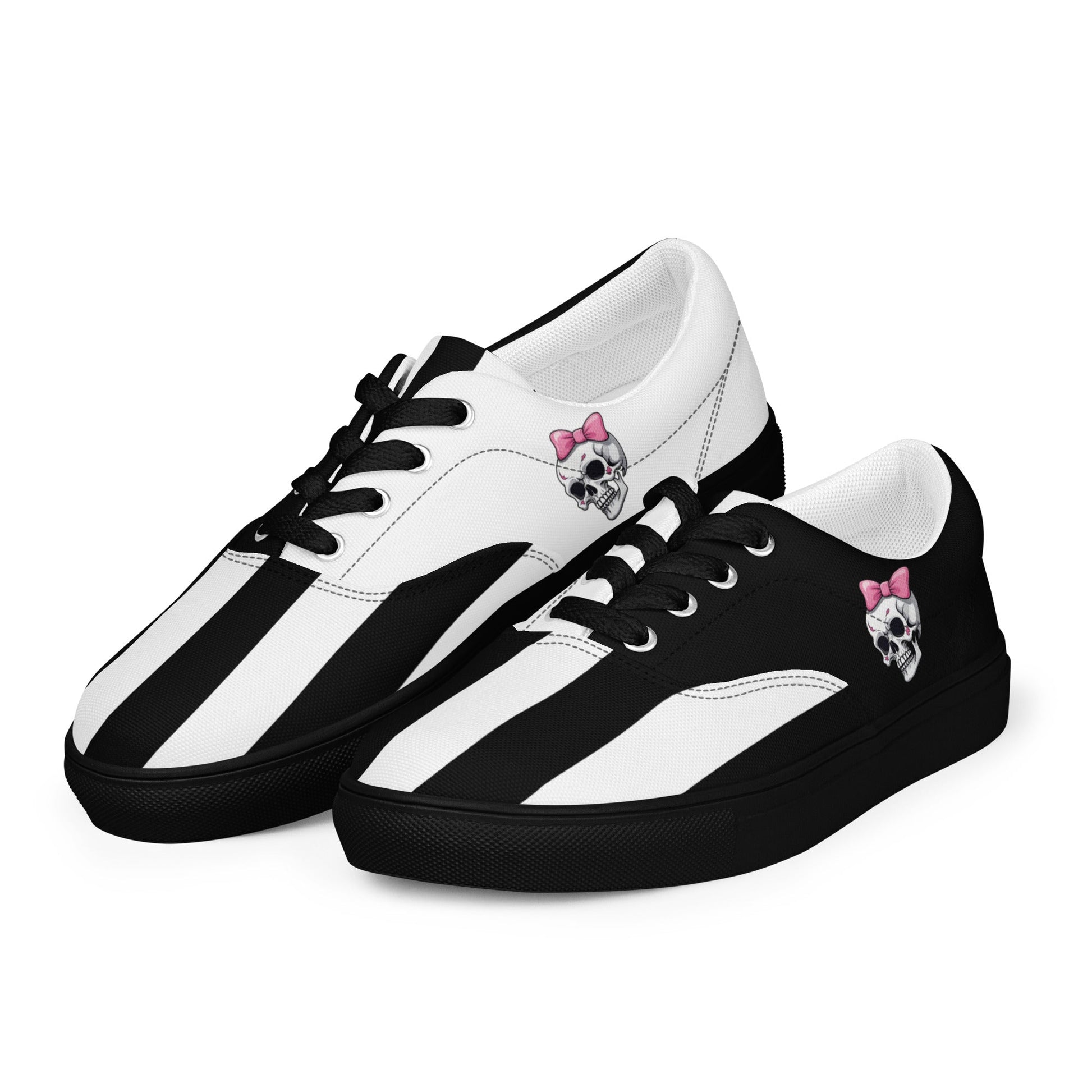 Black and White Girly Skull with Pink Bow Women’s Lace-up Canvas Shoes