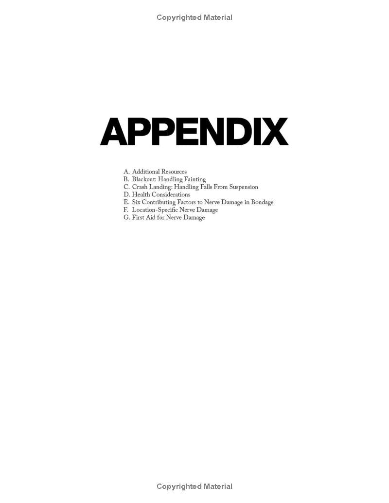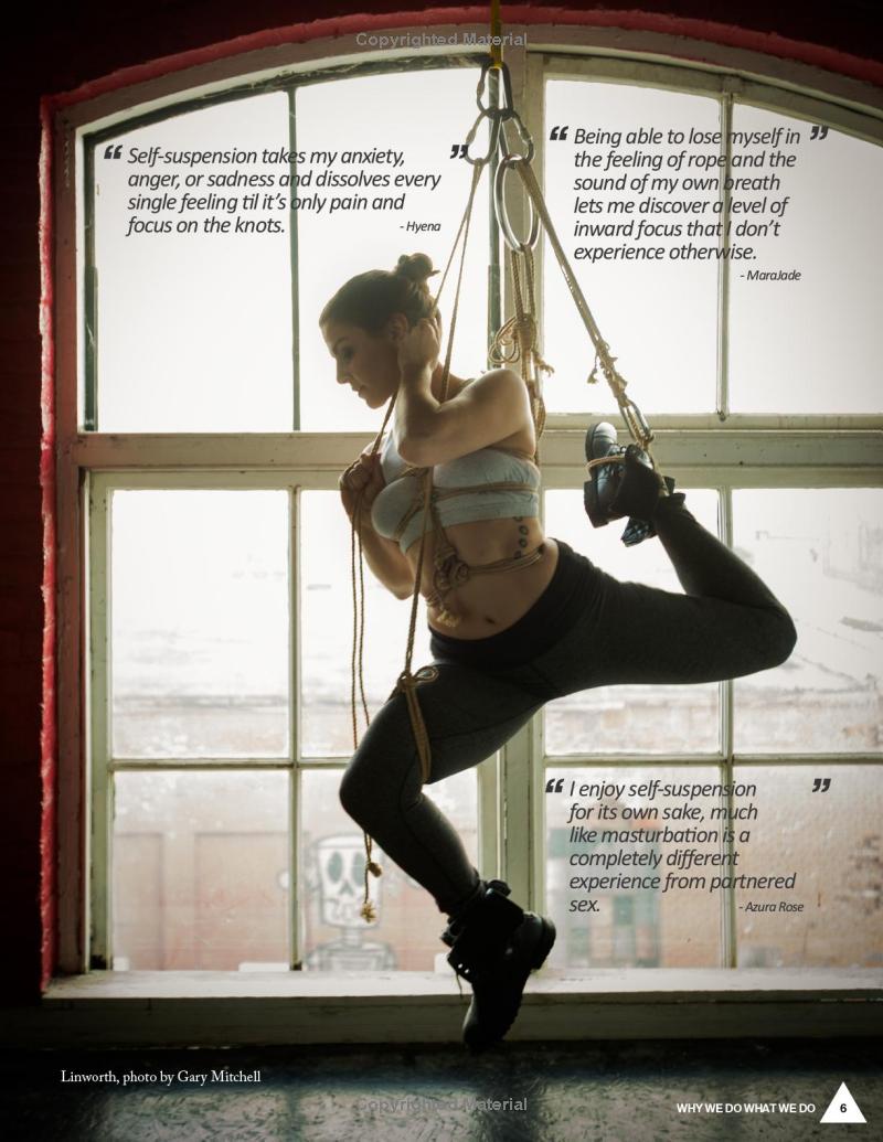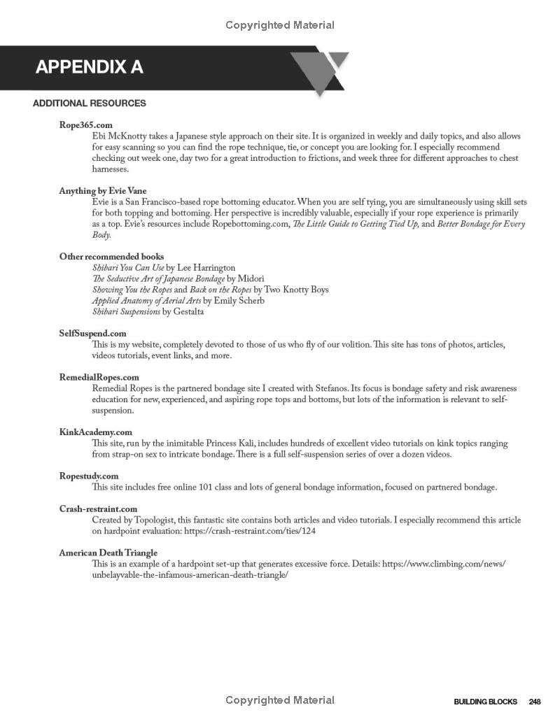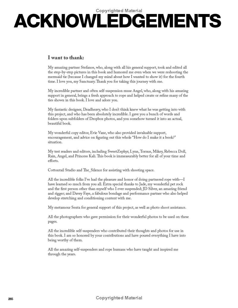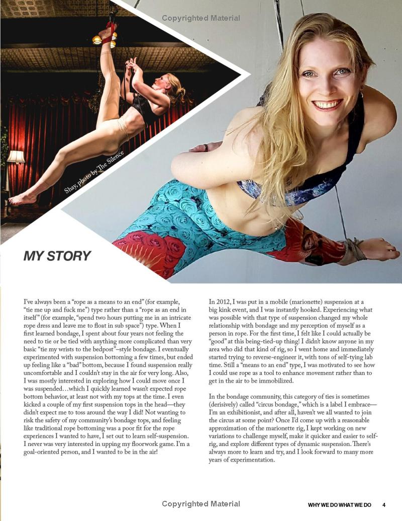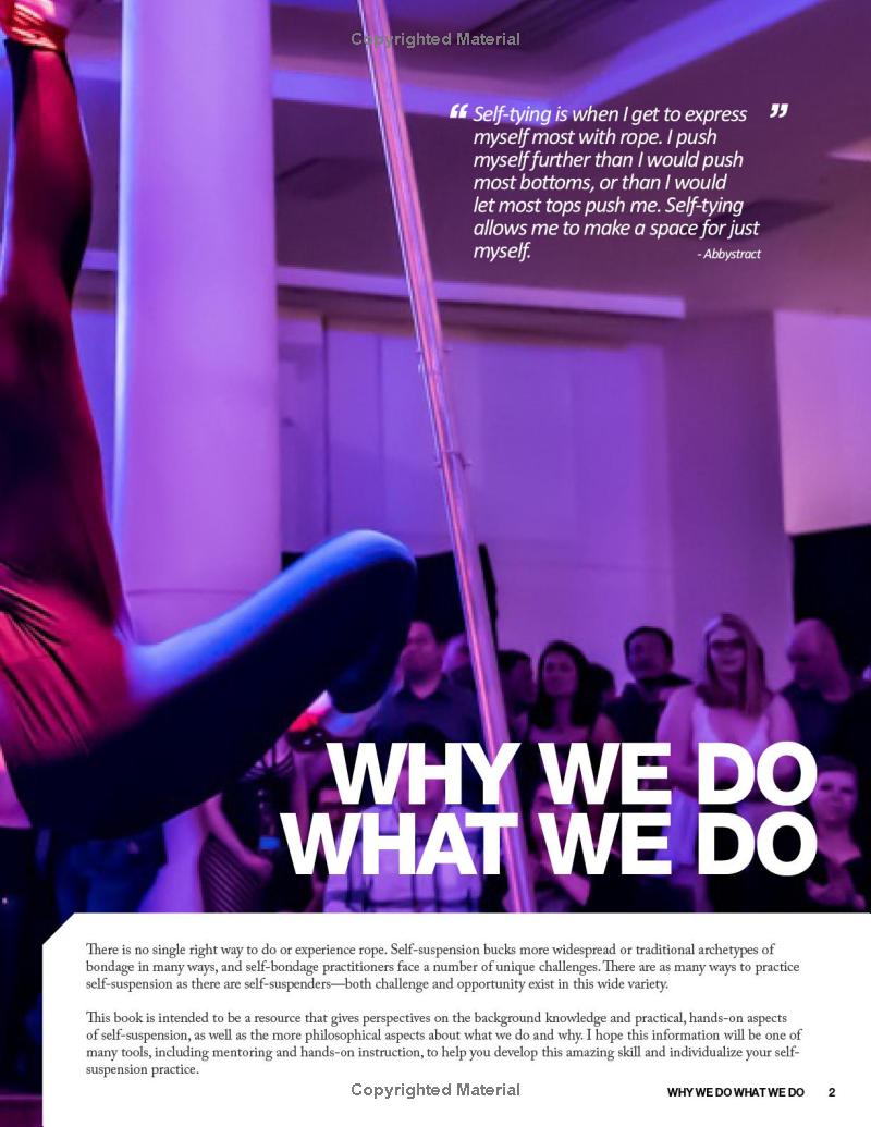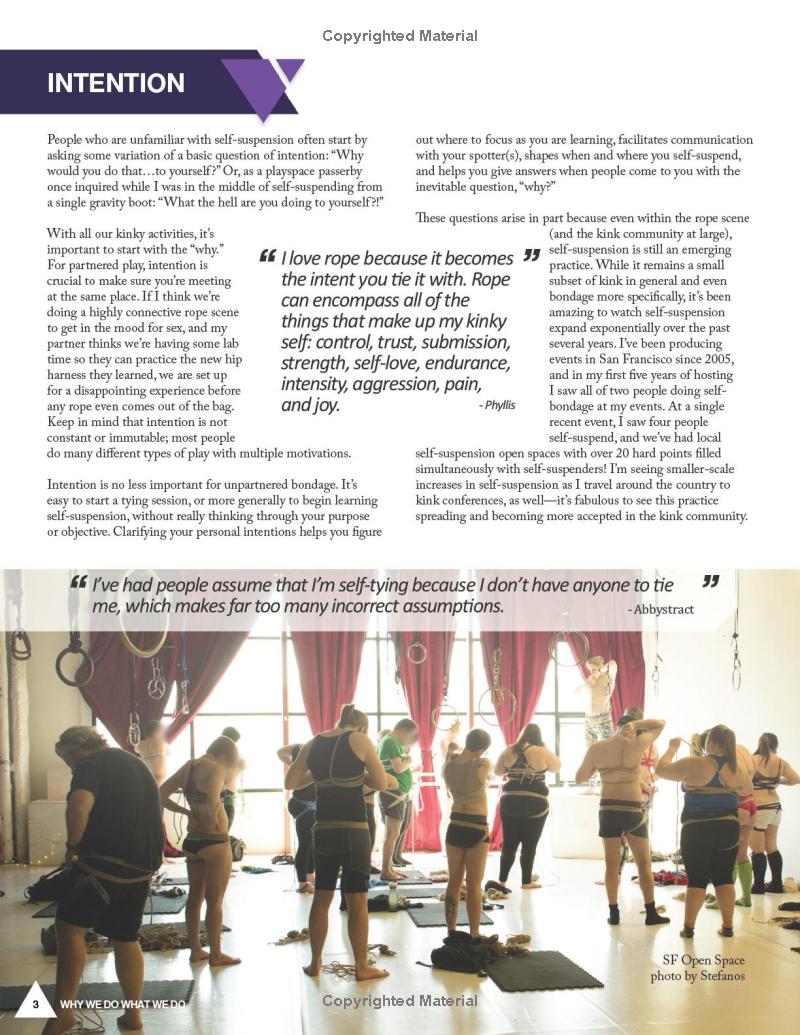 Self-suspension can be used for dynamic movement, exploring intense sensation, performance, learning partnered bondage, ritual, and more. This first-ever guide to self-suspension takes a thorough and nondogmatic approach, including everything from meticulous safety information to practical step-by-step rope bondage instruction. Beautiful color photography with a diverse range of self-suspenders is featured throughout. Whether you’re brand new to rope or you already have years of practice, this reflective and nuanced approach has something for you! Preparing your body to both tie and be tied, building a rope kit, communicating with a spotter, creating a self-suspension community, assessing risk, and much more are all discussed. There are hundreds of instructional photos and detailed explanations of ties, including multiple variations on chest and hip harnesses as well as leg ladder, mermaid, bent leg ties and much more. After how to build a solid foundation is explained, in-air skills including upline theory and practical management plus a wide variety of specific self-suspension rigs are covered.