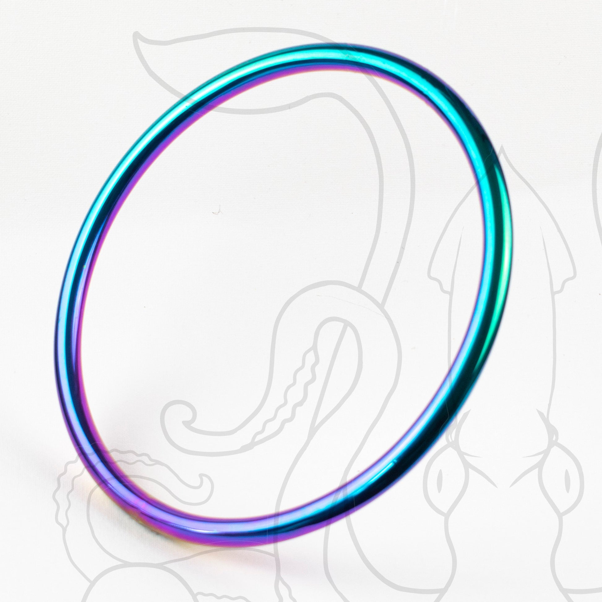 NOTE: No two rainbow coatings will be identical. The two sides of the ring will be different colors. There will be 1-2 small marks on the ring where it was hang-dried on a wire after the titanium plasma coat. This is not a defect and will not enlarge, spread, or reduce the integrity of the coating or ring.