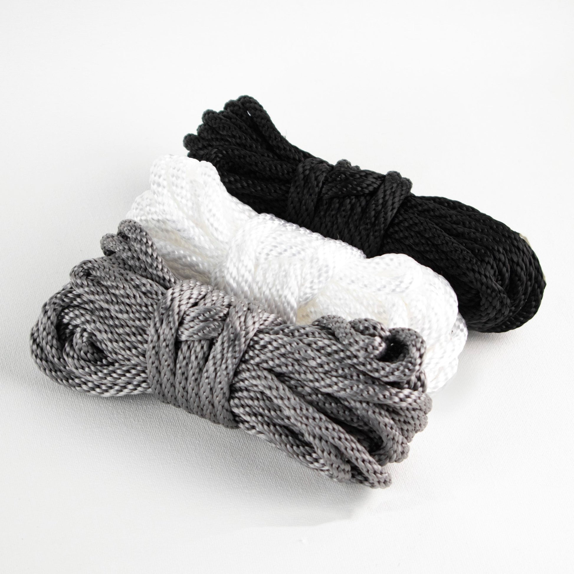Top quality 100% MFP bondage/suspension rope. MFP (multifilament polypropylene) is a waterproof rope that is resistant to most oils and lubricants. Unlike dyed ropes, this rope is braided with pre-colored fiber so that the color is vibrant throughout and does not bleed or fade. The rope is machine washable and easily cared for. A PDF detailing our MFP’s full specifications, including break weights, can be found here. All of our MFP is braided to our specifications at a local rope facility; the rope is braided specifically with bondage/kink in mind, so that it’s soft and smooth on the skin while still holding a knot well.