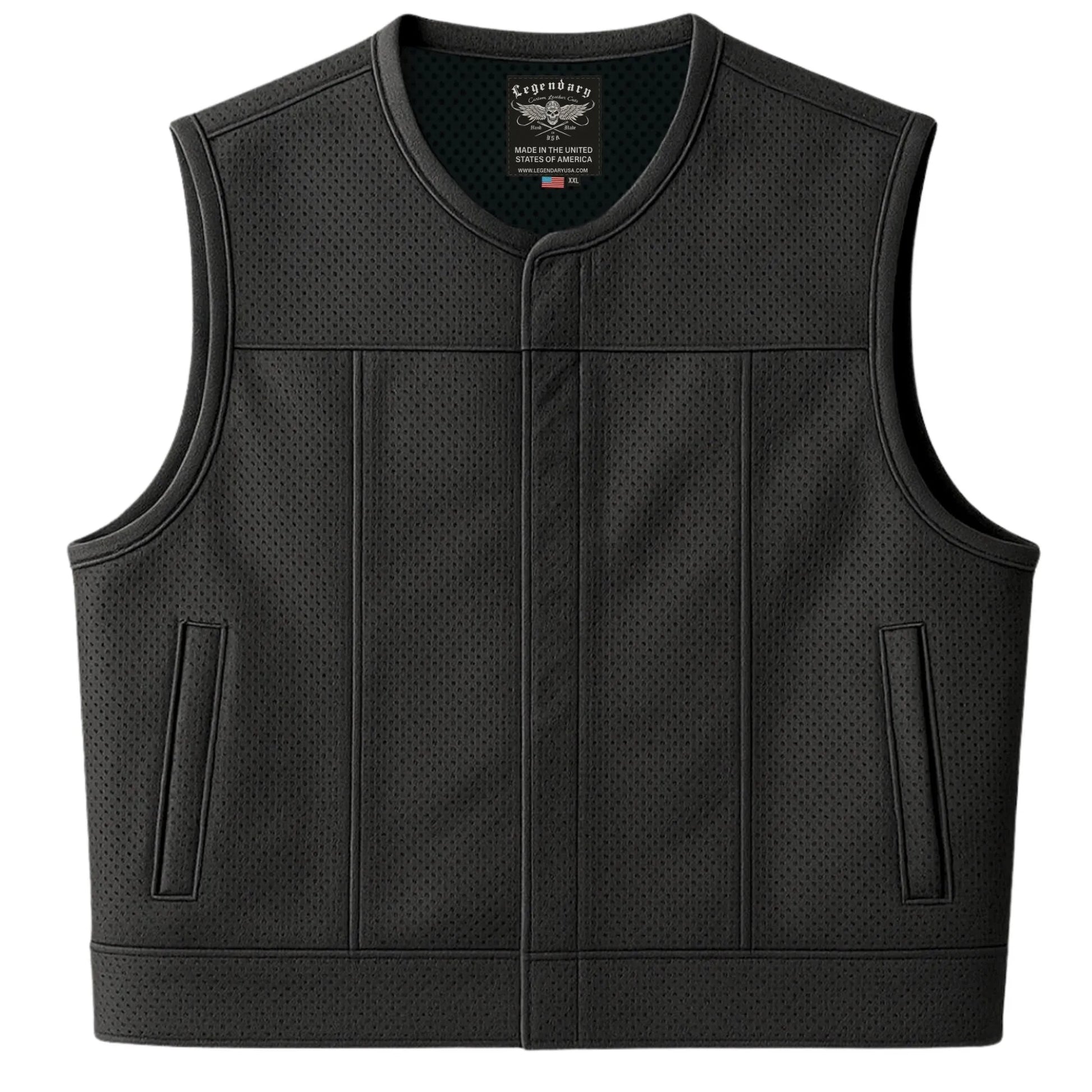 Legendary Lowlife NCP Perforated (No Chest Pockets) Cropped & Fitted Leather Perforated Motorcycle Vest is built with rugged 1.4mm naked perforated cowhide leather for added durability. This vest is 3" inches shorter than the traditional Legendary USA vest, offering a more cropped fit for comfort while riding. This is a traditional club vest, with a collarless design, the black leather vest has a one-piece back panel, leather-bound armholes, a hidden snap front, and a cropped brass zipper. Perfect for concealed carry, it comes with two secure gun pockets with quick release snap closures. The cropped design and premium features make it ideal for riders who want both style and practicality. Available in Black.