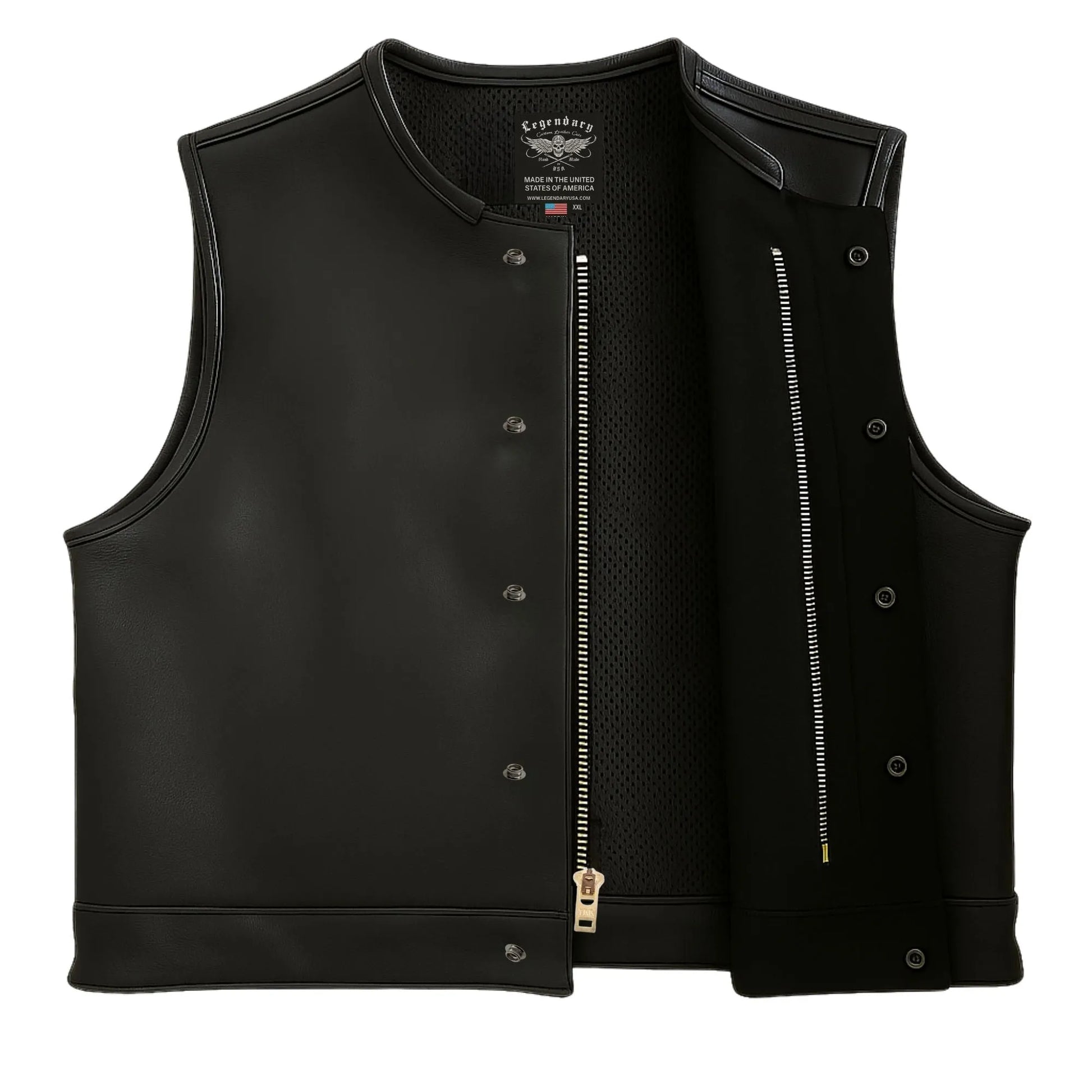 Legendary LowLife NOP Cropped Fitted Leather Club Style Motorcycle Vest in Black is built with a rugged 1.4mm naked cowhide leather for added durability. This vest is 3" inches shorter than the standard Legendary USA vest, offering a more cropped fit for comfort while riding. This is a traditional club vest, with a collarless design, this black leather naked cowhide vest has a one-piece back panel, leather-bound armholes, No Exterior Pockets, and a hidden snap down front with a cropped polished brass YKK zipper. Perfect for concealed carry, it comes with two secure gun pockets with quick-release snap closures. The cropped, sleek design and premium features make it ideal for riders who want style and practicality.