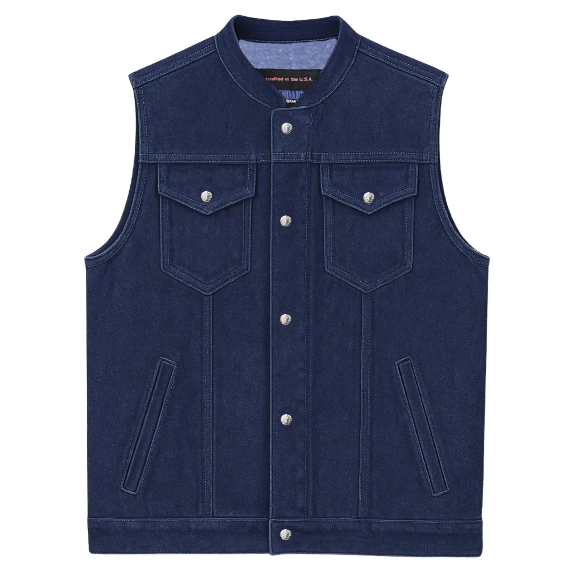 Experience the best of American craftsmanship with the Legendary Blue Revolution Men's Denim Motorcycle Vest—lightweight, durable, and fully customizable to suit your style.