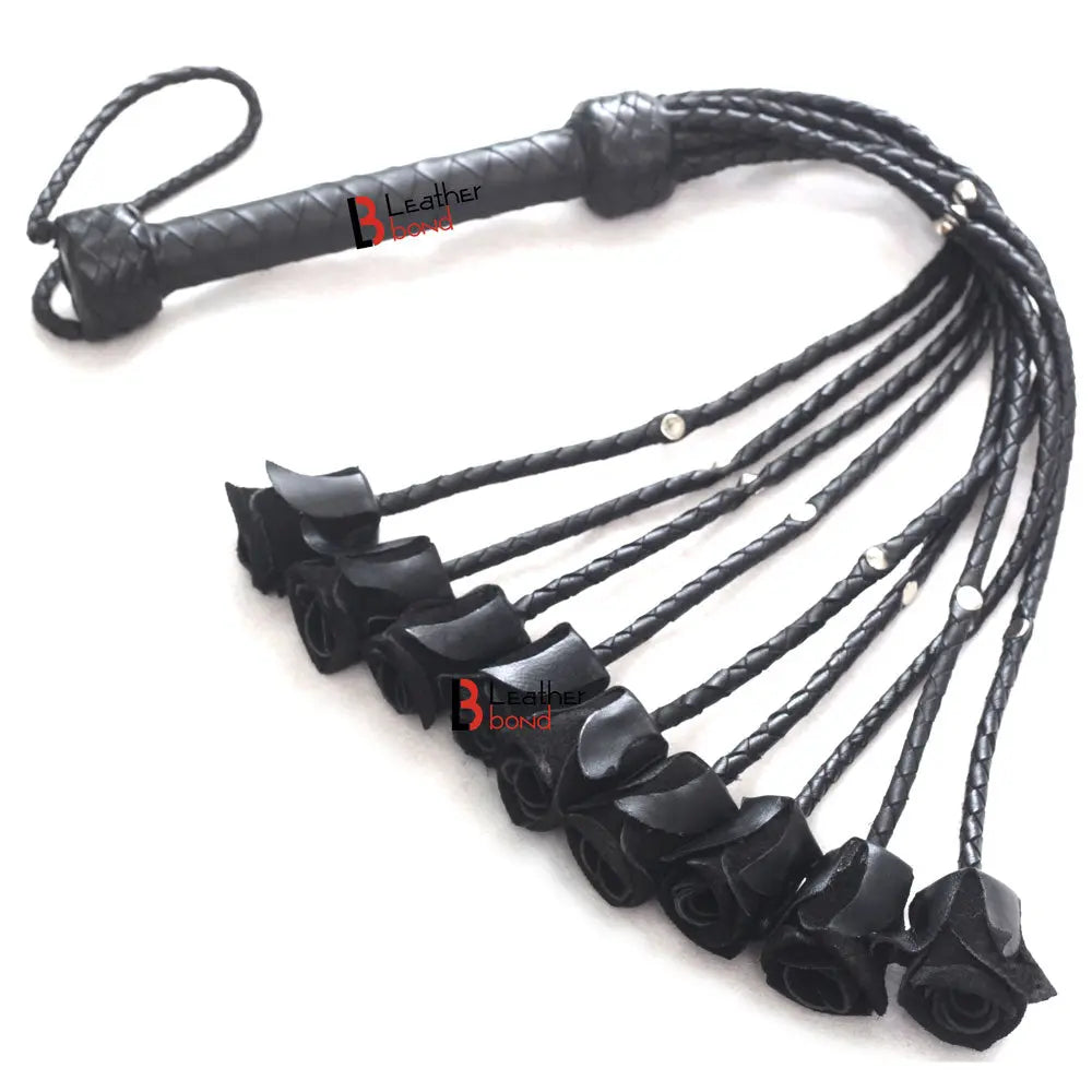 Rose Flogger Real Genuine Cowhide Leather 9 Braided Falls Heavy Black Roses & Steel Studs Cat-o-nine Tails