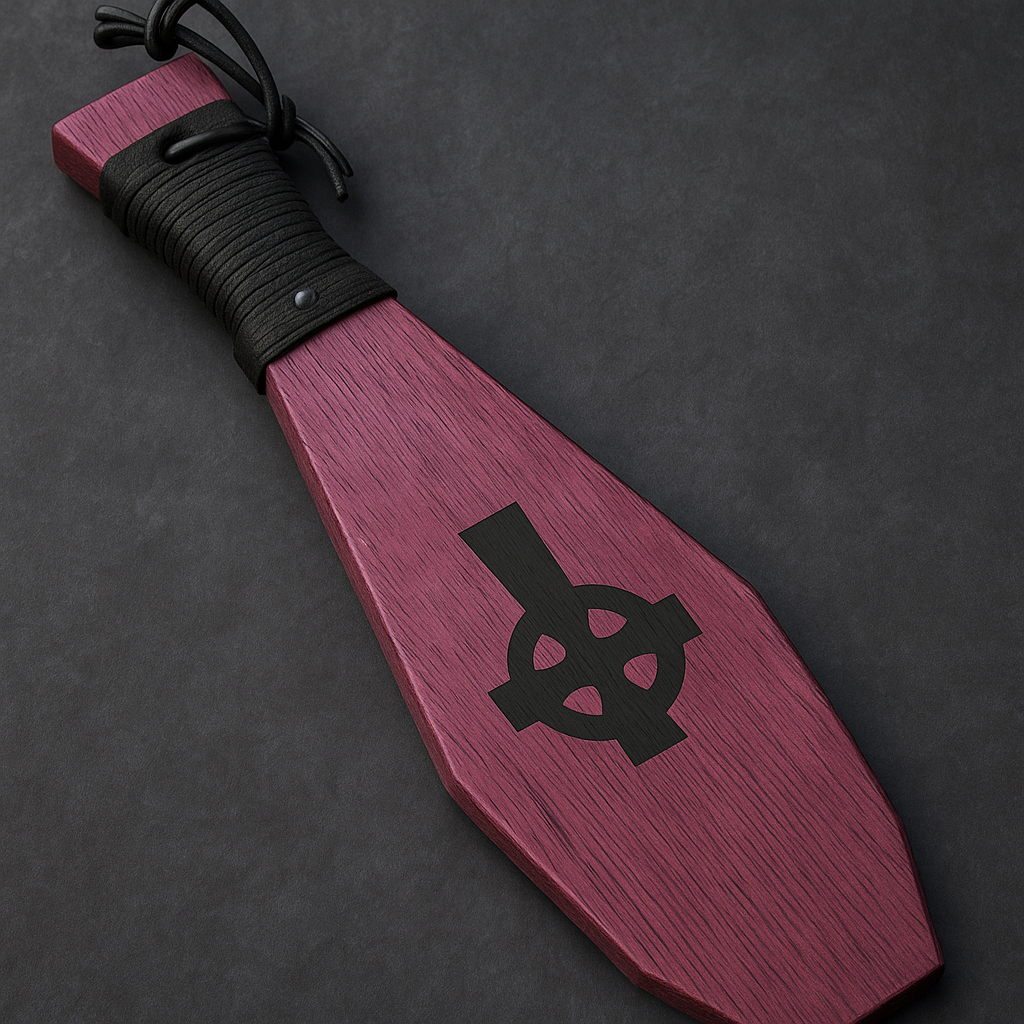Carved from genuine Purpleheart — a wood as strong as it is symbolic — this full-size paddle delivers a crisp, resonant strike with unmistakable presence. The surface bears a deep black Celtic cross, engraved with precision to represent endurance, consequence, and control.