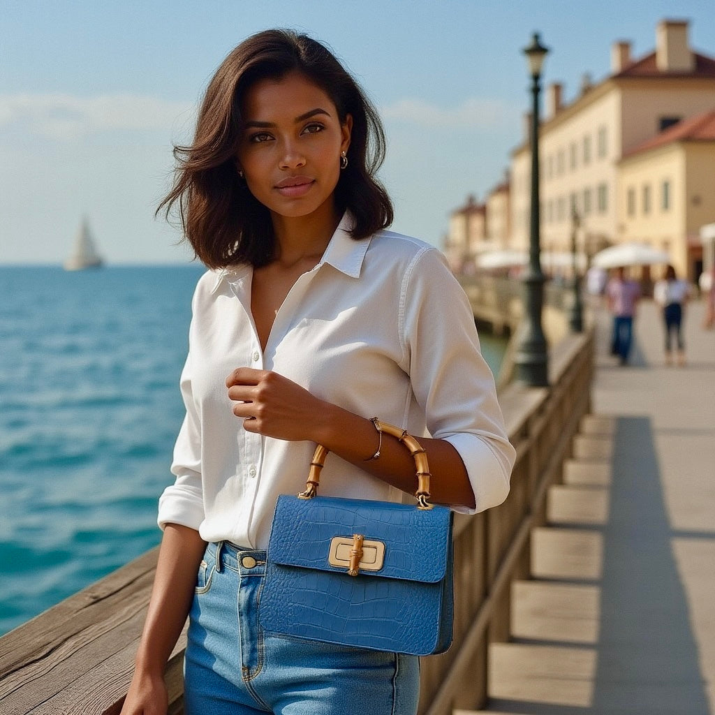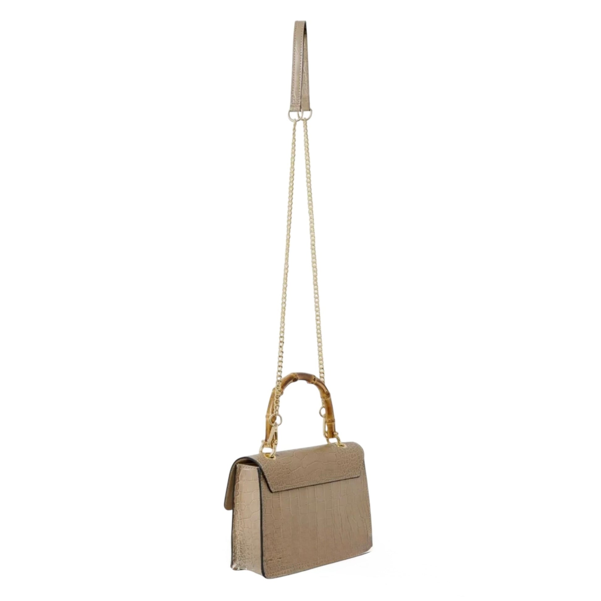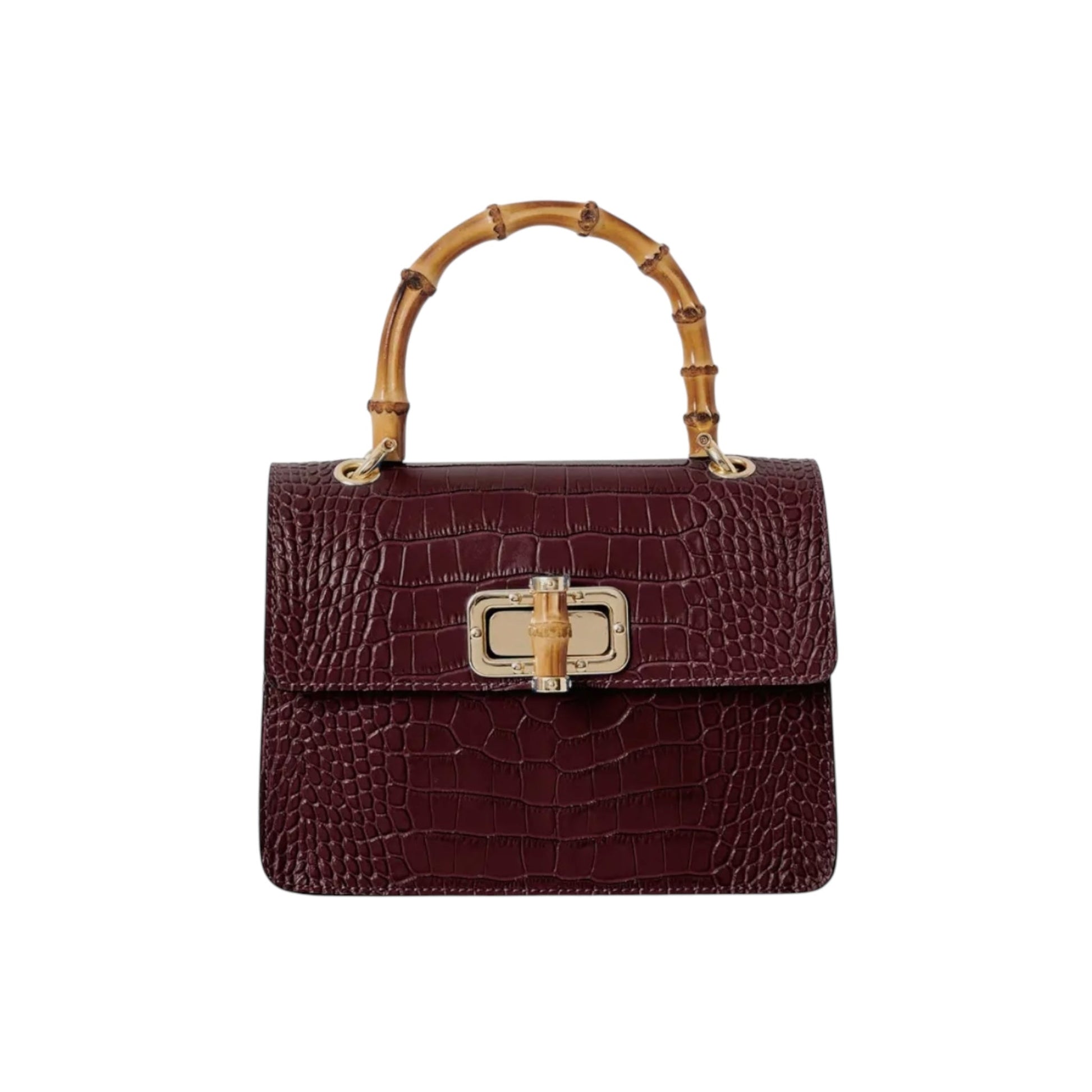 THE MINI HARRIET is the perfect mix of sophisticated and retro. Made from croc embossed Italian leather, this handbag features a genuine bamboo top handle and is embellished with a metal and bamboo interlocking closure. The perfect size for day or night, this bag makes sure you stand out from the crowd.