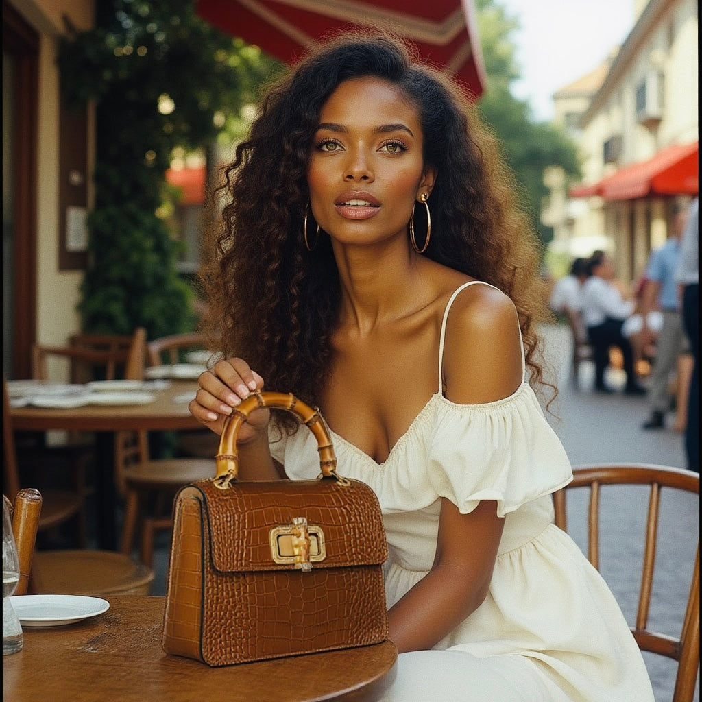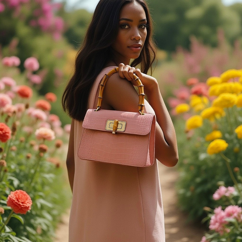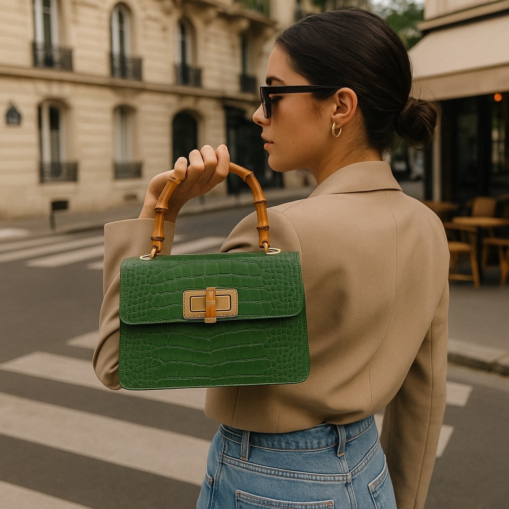 THE MINI HARRIET is the perfect mix of sophisticated and retro. Made from croc embossed Italian leather, this handbag features a genuine bamboo top handle and is embellished with a metal and bamboo interlocking closure. The perfect size for day or night, this bag makes sure you stand out from the crowd.