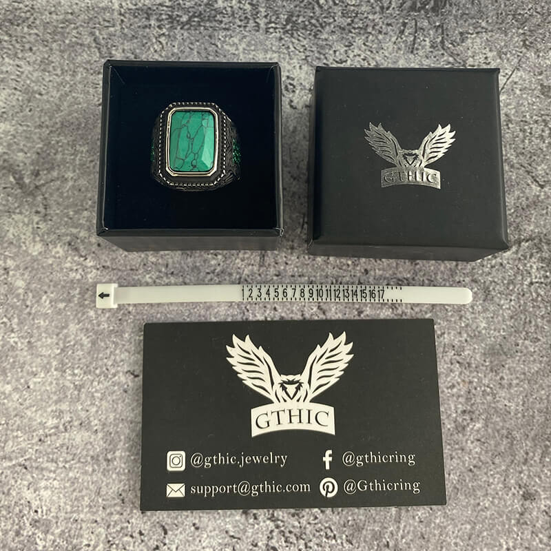 This stunning vintage turquoise inlaid stainless steel ring is a timeless piece of jewelry with a luxurious stainless steel design featuring an intricate turquoise inlay on the front, gothic patterns on the sides, and green zircons for a Create a sophisticated and unique look. Easily inject elegance and luxury into your outfits.