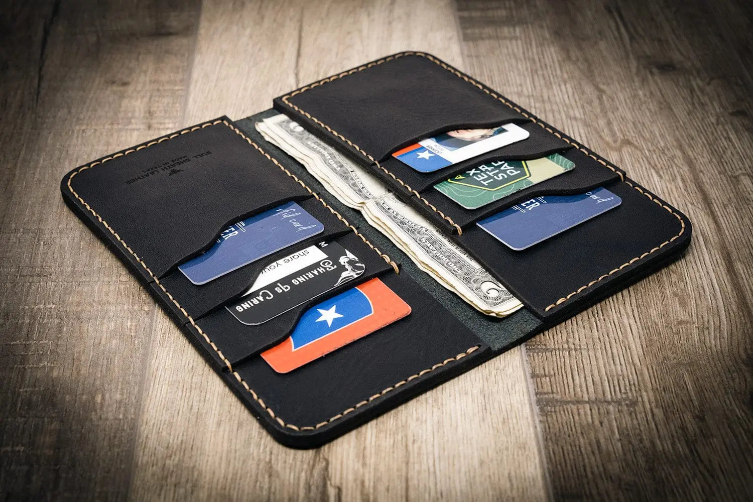 We have added a Western Long Wallet to our lineup of personalized mens leather wallets. This long wallet for men is a tall bifold wallet built in a traditional style, that can hold all of your credit cards, debit cards, and even a checkbook. We take pride in our handmade leather wallets and personalized gifts for men. This leather long wallet will provide you with an every day carry as big as Texas!